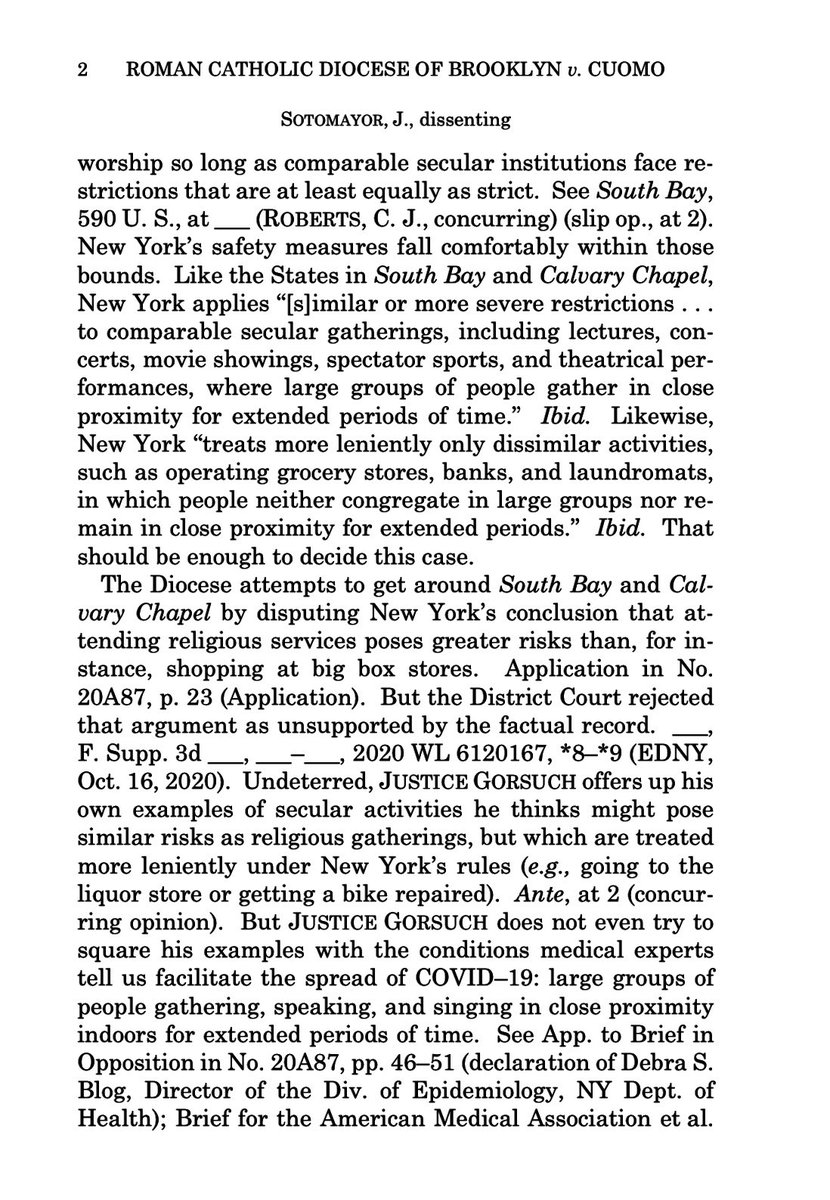 Justice Sotomayor calls out Gorsuch for not wrestling with the actual science driving New York’s emergency public health restrictions which make clear the extra danger posed by religious services w/ large groups indoors, in tight proximity, for extended periods of time. #COVID19pic.twitter.com/NsnpCObuwS