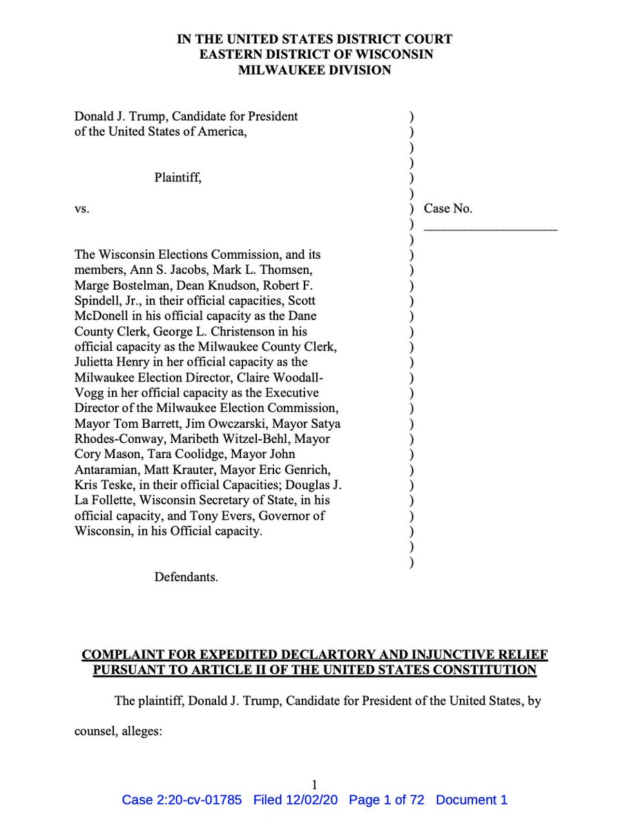 Read a copy of Trump's Tuesday-lawsuit challenging the Wisconsin election outcome here --> https://lawyerscommittee.org/wp-content/uploads/2020/12/Trump-v-WEC-EDWI.pdf … As with other suits, there is a particular focus on places that are home to many Black voters -- Milwaukee & Dane Counties.