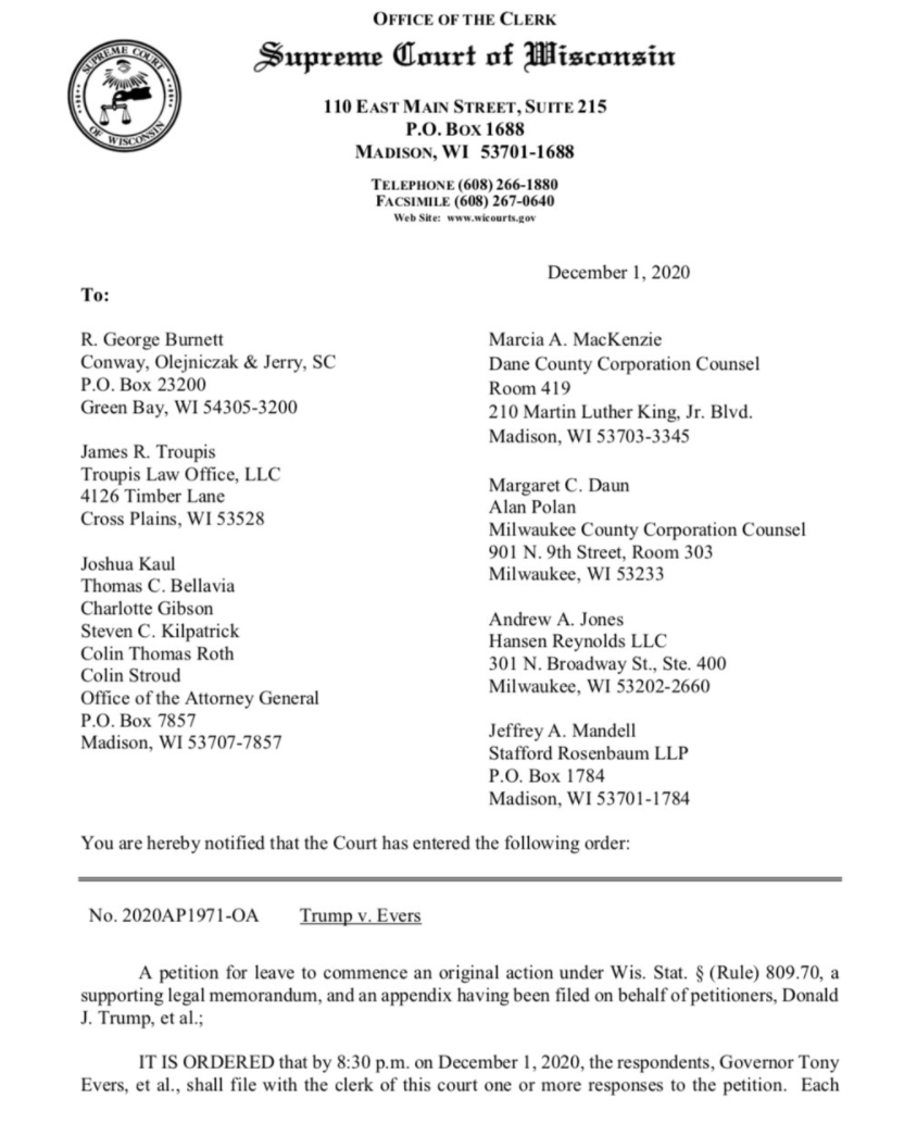 A copy of the Wisconsin Supreme Court order declining to hear Trump's baseless post-election challenge can be found here --> https://lawyerscommittee.org/wp-content/uploads/2020/12/2020AP1971-OA.pdf …