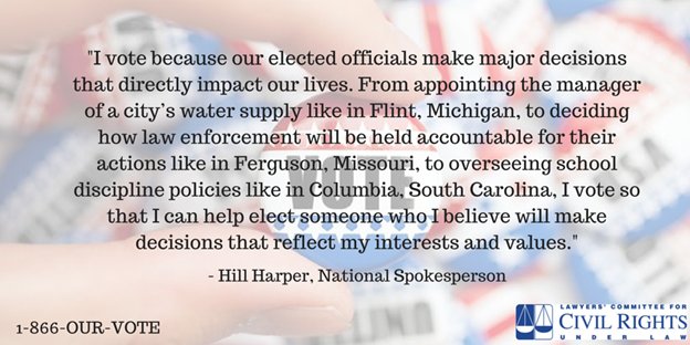 This is why @HillHarper votes! Contact 866-OUR-VOTE if you encounter problems at the polls today. #ProtectOurVotepic.twitter.com/wn9Z8lxKpP