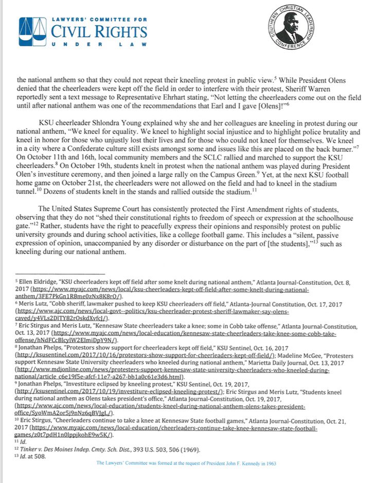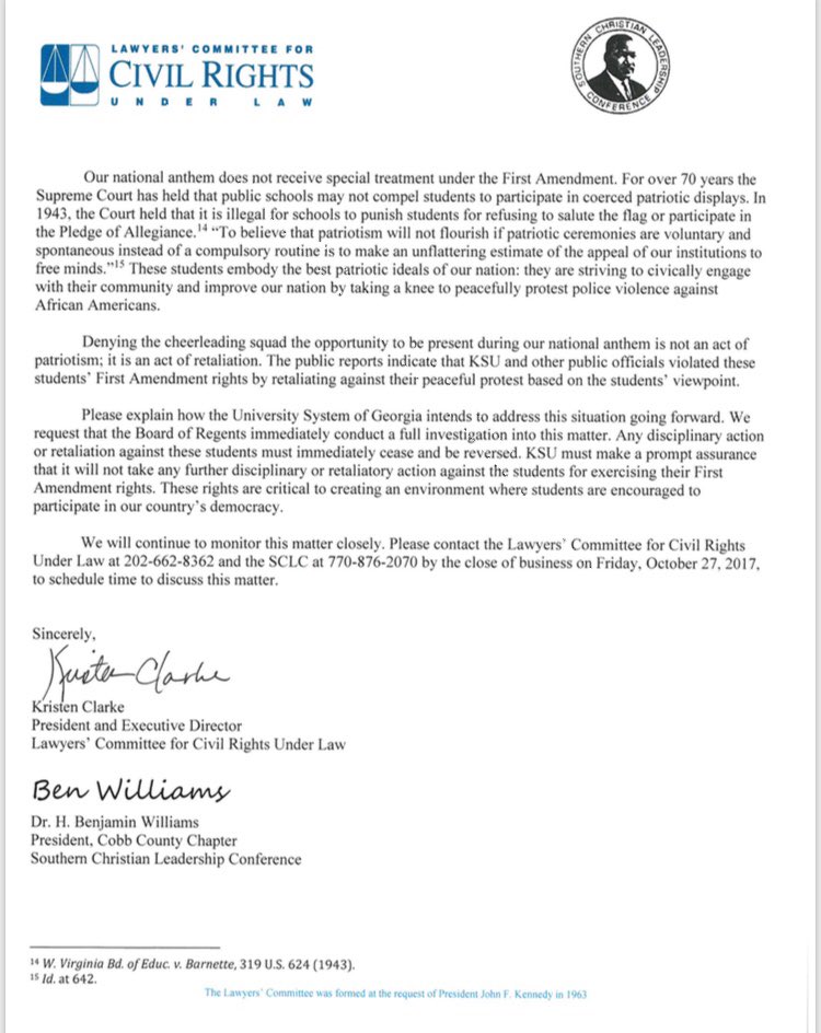 VICTORY! Kennesaw State Univ. relents, will respect 1st Amendment rights of cheerleaders who #TakeTheKnee, following @LawyersComm action.