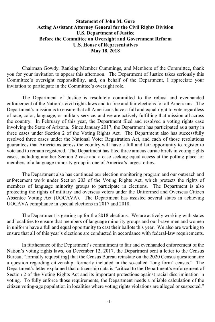 John Gore, acting head of DOJ’s Civil Rights Division, gives testimony on #census2020. His claim that the 11th hour addition of a citizenship question will not have a chilling effect on participation in the Census is baseless. That’s why we sued this administration. @LawyersCommpic.twitter.com/XXpHeYtaMo