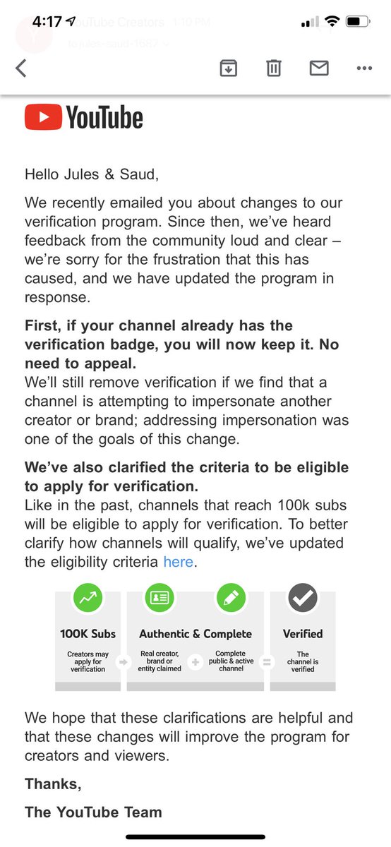 Hi @TeamYouTube our verification was removed when the originally email was sent out but we received a second email saying things have changed and we would keep our verification but it’s already been removed. How can we get it back?pic.twitter.com/HmsIfDkw6H