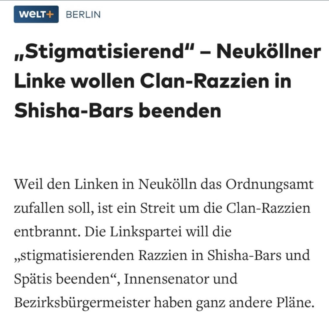 Der Berliner Stadtteil Neukölln ist ein Rückzugsort der Organisierten Kriminalität.Die Linkspartei will dort jetzt die „stigmatisierenden Razzien in Shisha-Bars und Spätis beenden“. Folgt dem bald eine Quote für Strafverfolgung?https://www.welt.de/politik/deutschland/article234709806/Berlin-Stigmatisierend-Neukoellner-Linke-wollen-Clan-Razzien-in-Shisha-Bars-beenden.html?source=k325_variationTest_autocurated …