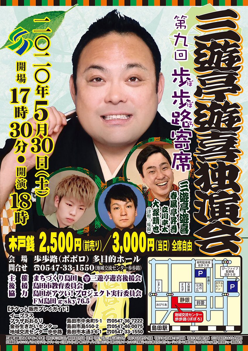 今年もやります 2020年5月30日 第9回歩歩路寄席「三遊亭遊喜独演会」 出演三遊亭遊喜 春風亭昇吾 立川幸太 大塚晴也(津軽三味線) 18:00開演 木戸銭 前売 2500円 当日3000円 会場 歩歩路多目的ホール 問合せ0547ー33ー1550 (地域交流センター歩歩路)pic.twitter.com/T5OtjIK8uu