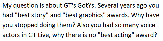@sashazyryanov We're actually making our entire episode of tonight's GT Live about the awards' process; we'll try to cover these things!