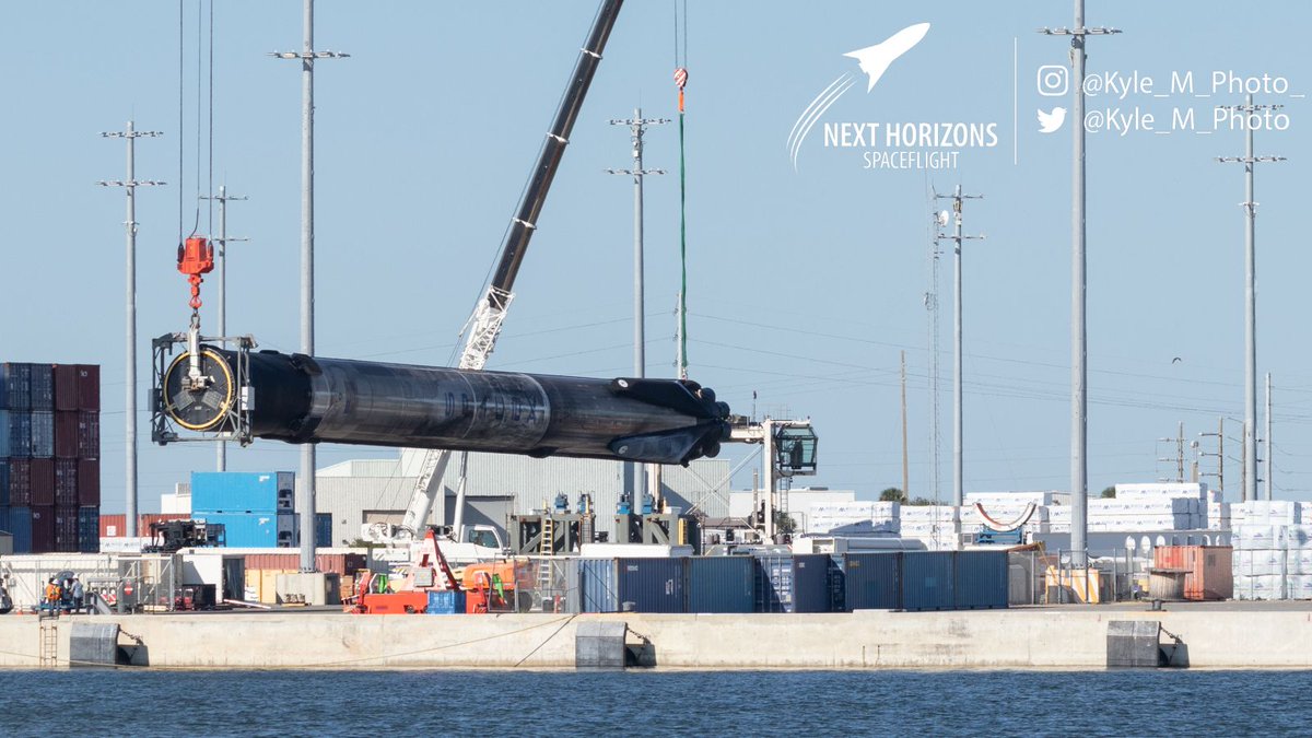 Pretty much horizontal now, soon the transporter will roll over from the right and under the booster then the booster will be lowered the rest of the way down onto the transporter. #SpaceXFleet #SpaceXpic.twitter.com/3sEl09uMV6