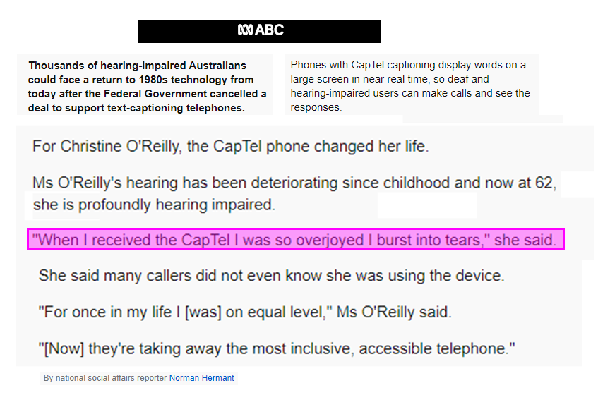 Scott Morrison is pushing the hearing impaired back to technology from the 80's for electronic telephone translation services. Slashing funding by a massive 76.5% from $31.2m pa to $7.34m pa Paul Fletcher's excuse ........... it was too expensive.