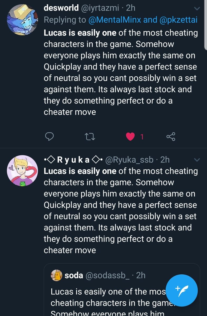High tier player gets pushback for playing their character correctly and tries to make it a big deal as a victim. Lucas players get pushback for playing their character "correctly". Lucas Players:pic.twitter.com/UwZRY5HaNT