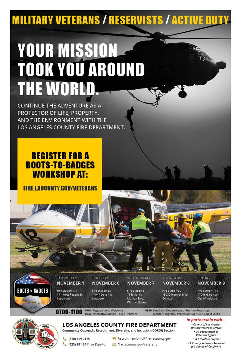 Military Veterans/Reservists/Active Duty... Sign up for a free Boots-to-Badges workshop next week and find out how you can become a proud protector of life, property, and the environment with LACoFD: http://fire.lacounty.gov/veterans .pic.twitter.com/an47MsICnM
