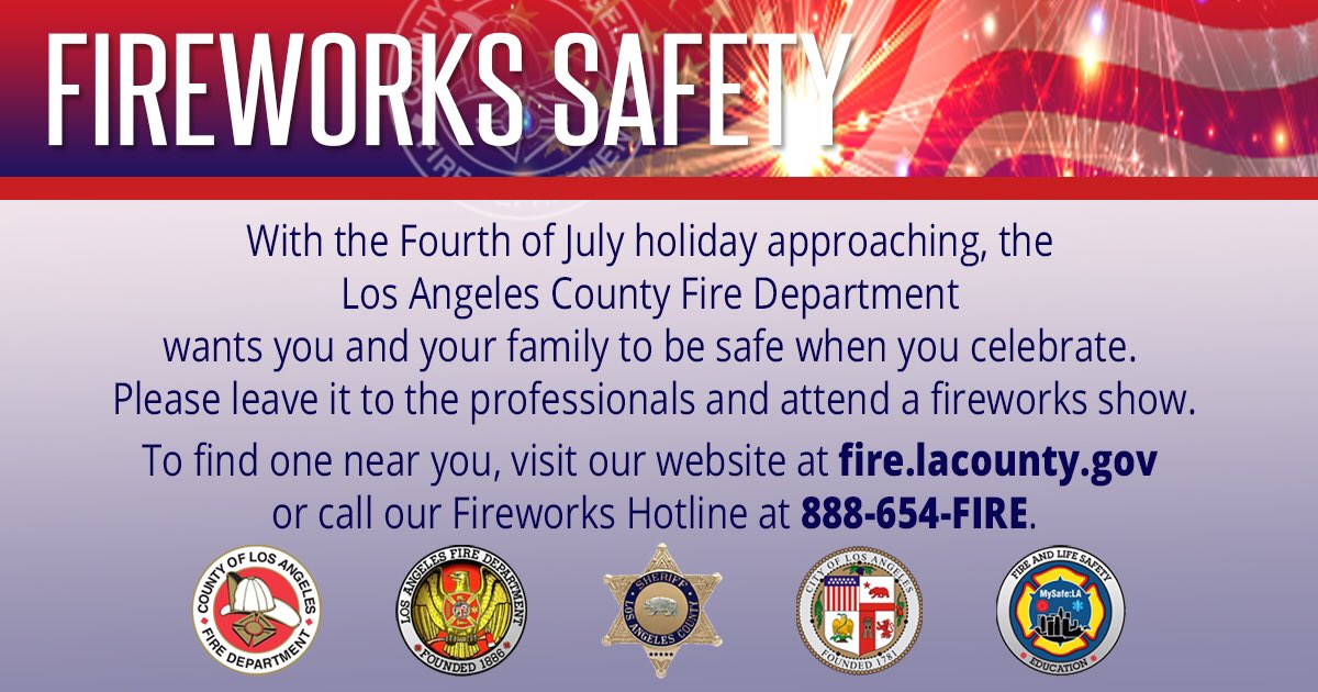 The best way to enjoy this Fourth of July holiday, while keeping your family and community safe, is to leave the fireworks to the professionals! To find a show near you, visit http://fire.lacounty.gov or call our Fireworks Hotline at 888-654-FIRE.pic.twitter.com/XgvSBjINyY