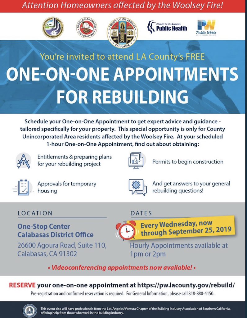 Attention homeowners affected by the Woolsey Fire! Schedule a free one-on-one appointment for your rebuilding project. Make an appointment today to receive expert advice and guidance specifically for your property. To register, visit: http://pw.lacounty.gov/rebuild pic.twitter.com/jyfdw02bKQ