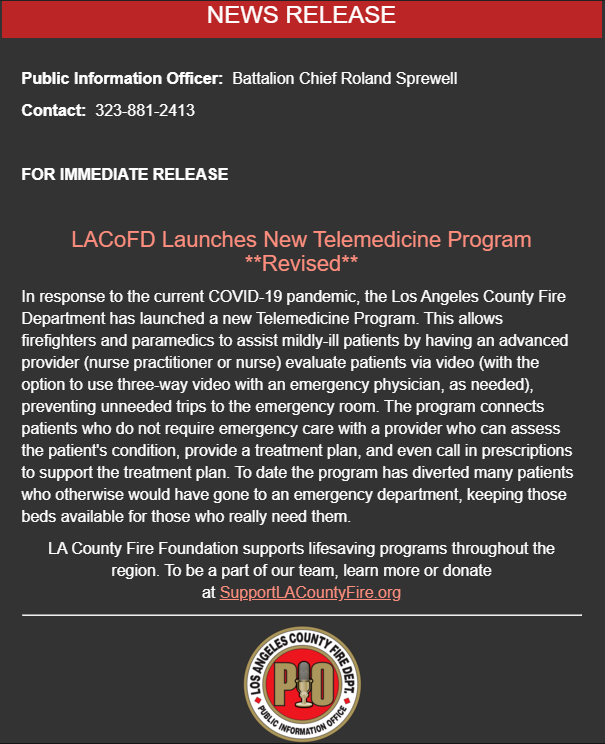 Thank you to our EMS Bureau, the LACoFD Foundation (@LACountyFire1), & @CountyofLA Quality and Productivity Commission for making our Telemedicine Program possible. #Teamworkhttps://twitter.com/LACoFDPIO/status/1246169911837093889 …
