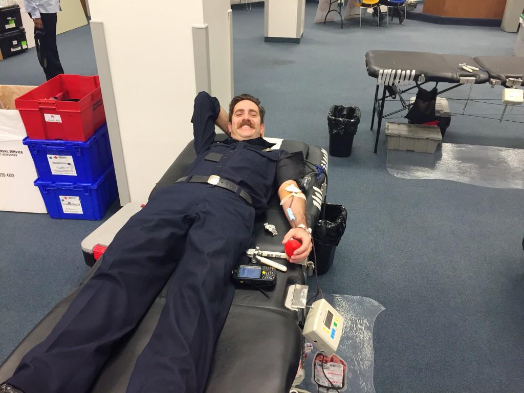 Early this morning: Battle of the Badges #BloodDrive Inglewood City Hall. #LACoFD PIO Wright was first to the table!pic.twitter.com/JzExj1AkSJ