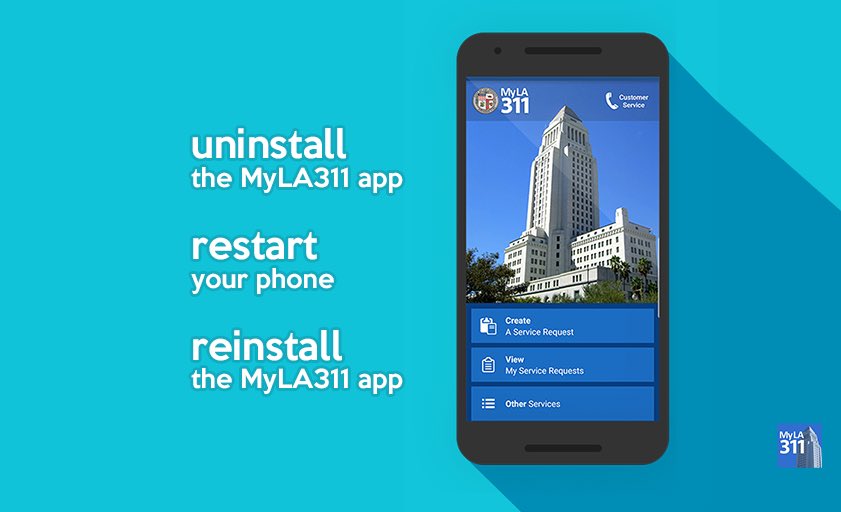 We recently pushed out an update to the #MyLA311 app. If you are currently experiencing issues with submitting requests, please reinstall your app. Our sincerest apologies for the inconvenience. If you need help, DM @MyLA311.pic.twitter.com/NpGxaeS9Pk