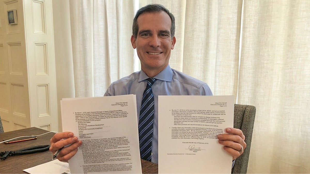 I am signing an Executive Directive establishing Census Liaisons in nearly every City dept to help ensure an accurate count in L.A. — and bringing together 160+ mayors to call upon the Trump admin to ensure an inclusive #Census2020 for our country. http://mayor.la/wvF430if3A0 pic.twitter.com/e0wBav9zPQ