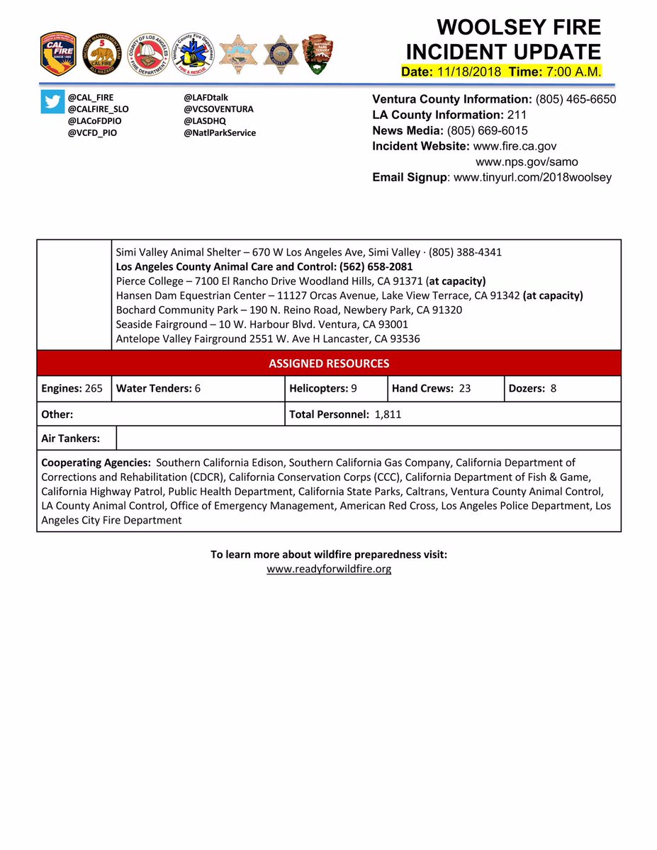 #WoolseyFire *UPDATE* Full Incident Fact Sheet for Sunday morning November 18th: 96,949 and 88% contained. @LACOFD @VCFD_PIO @LAFD @CAL_FIRE @LAPDHQ @CHP_HQ @VENTURASHERIFFpic.twitter.com/LZEfYcljqZ