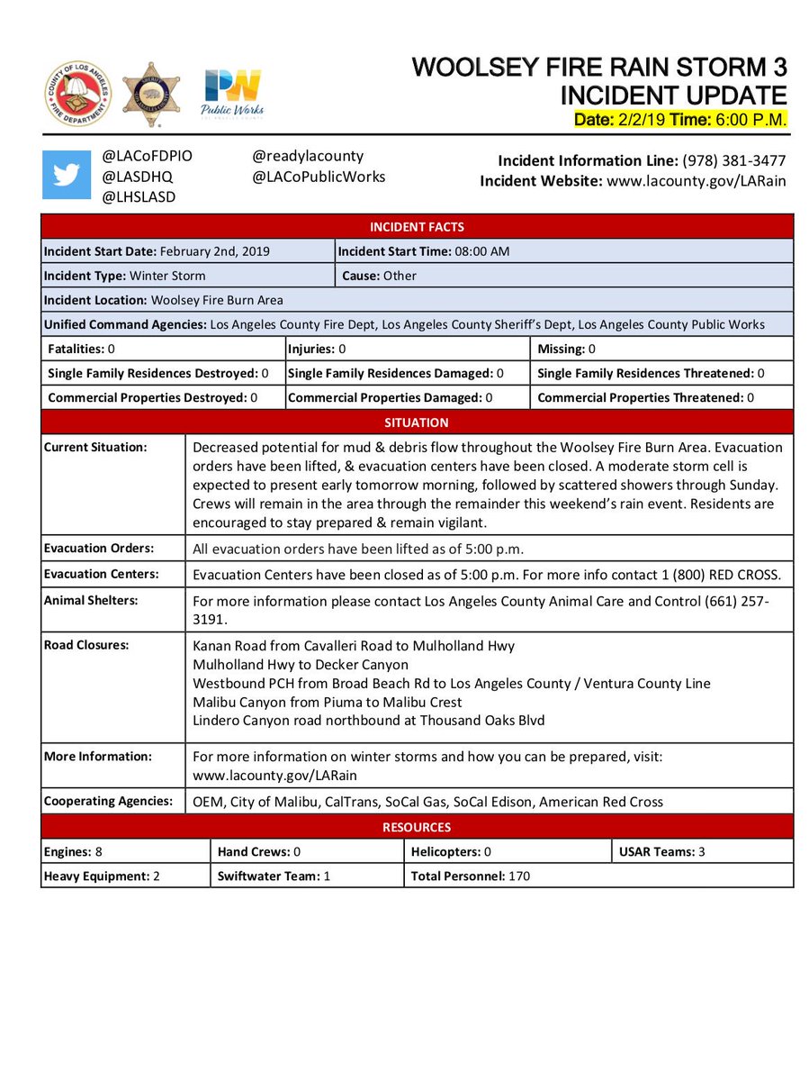 #WoolseyStorm *Incident Update* for Saturday February 2, 2019pic.twitter.com/151vqoumn1