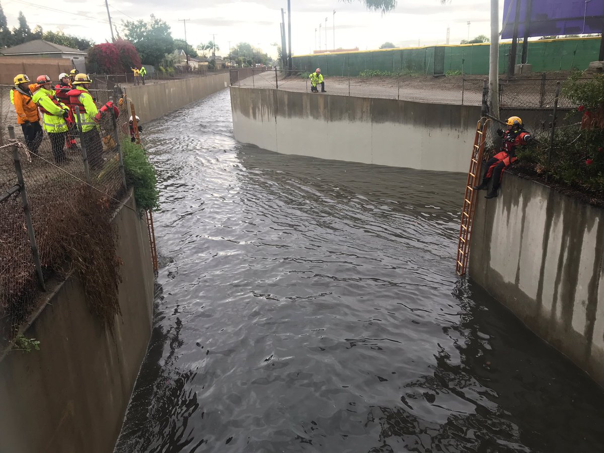 LACoFD units on scene currently effecting a water rescue of 2 persons, one in water, and one underground out of the water.