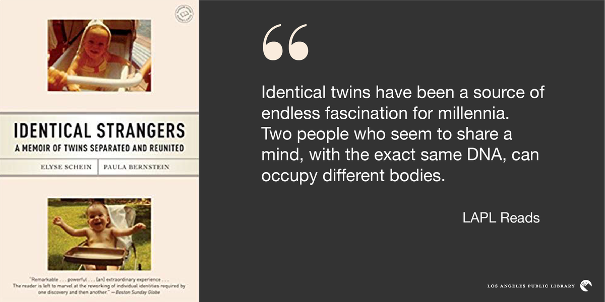 We are reading "Identical Strangers: A Memoir of Twins Separated and Reunited" by Elyse Schein: http://www.lapl.org/collections-resources/lapl-reads/review/identical-strangers-memoir-twins-separated-and-reunited …pic.twitter.com/DweBwJbwT0