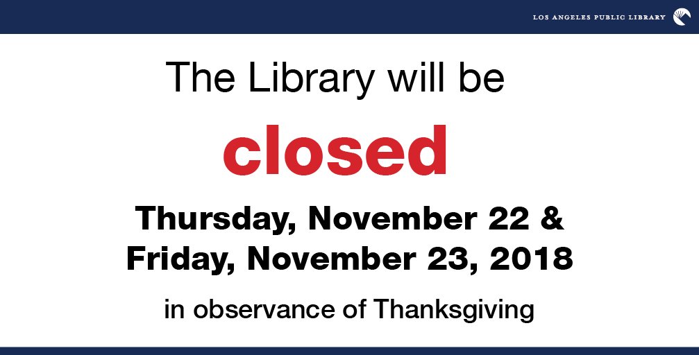 Stock up now for your post-Thanksgiving dinner reading. All libraries are closed Thursday and Friday for Thanksgiving. We are always open at http://www.lapl.org pic.twitter.com/eqpH3cP5Du