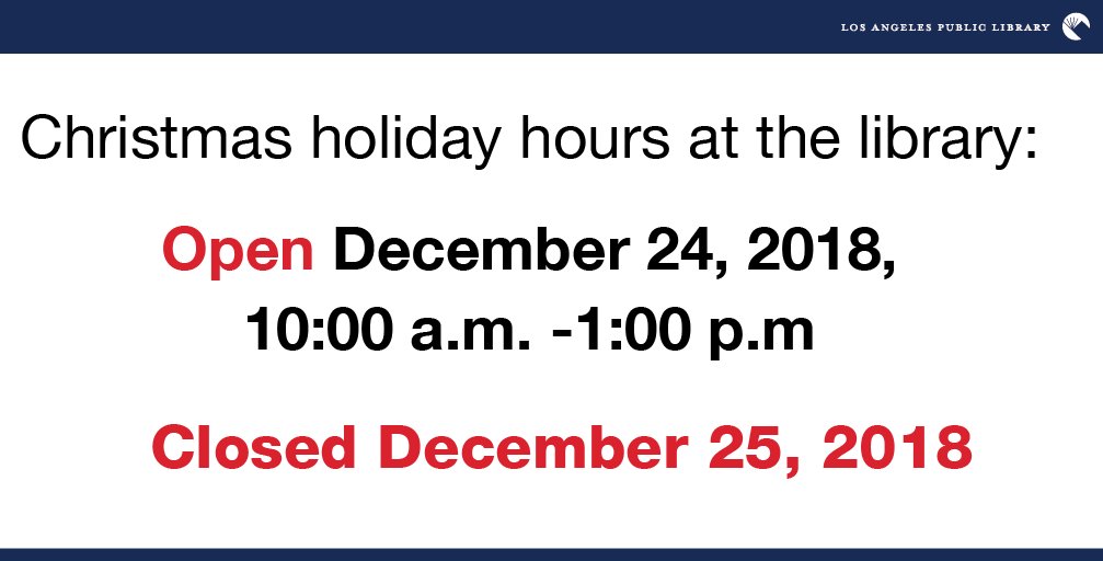 Plan ahead, all libraries will close at 1 p.m. on December 24. In addition, all libraries will be closed on December 25. We are always open at http://www.lapl.org pic.twitter.com/5hAAuz6W6y
