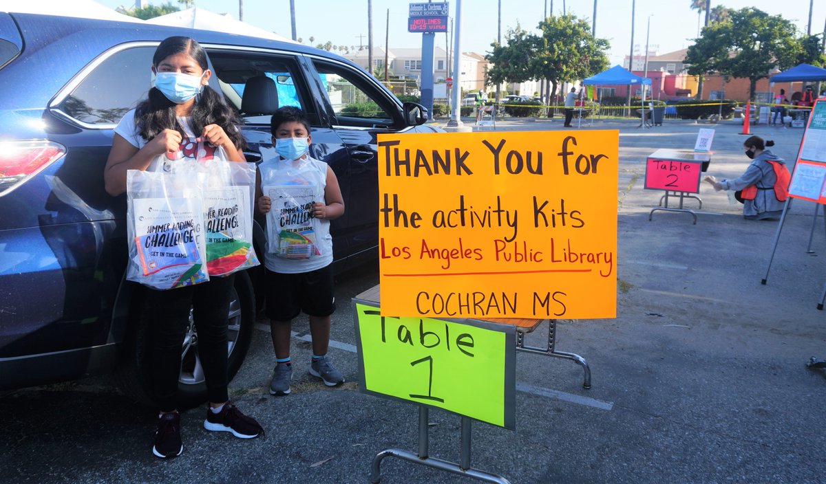 As part of a Lunch at the Library grant, the library distributed 4,000 activity packets filled with games, books and other fun stuff at eight LAUSD Grab and Go Food Centers across L.A., including Johnnie L. Cochran Jr. Middle School, where the packs were clearly a hit.pic.twitter.com/xPQJy8Zq1y