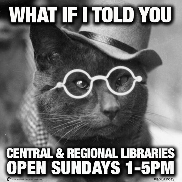 Central & regional libraries open today 1-5pm! #laplSundaypic.twitter.com/yJs80osrPU