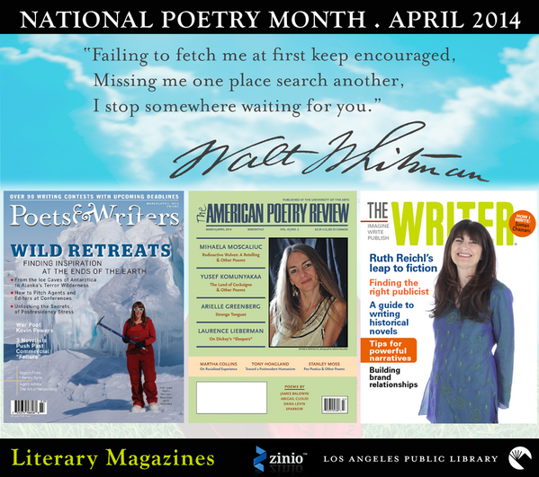 Literary magazines to enjoy this #NationalPoetryMonth! Download free w your library card http://bit.ly/1i5hqBj pic.twitter.com/5sXEd9UEd2