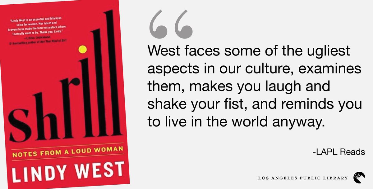 We are reading Shrill : notes from a loud woman by Lindy West. http://lapl.me/uYKDqav pic.twitter.com/ULA6ODmGsZ