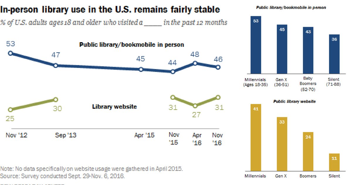 According to new Pew Research Center survey data, millennials are the most likely generation to use public libraries:http://www.pewresearch.org/fact-tank/2017/06/21/millennials-are-the-most-likely-generation-of-americans-to-use-public-libraries/?utm_content=bufferbb293&utm_medium=social&utm_source=twitter.com&utm_campaign=buffer …pic.twitter.com/BIdyfJjcsE