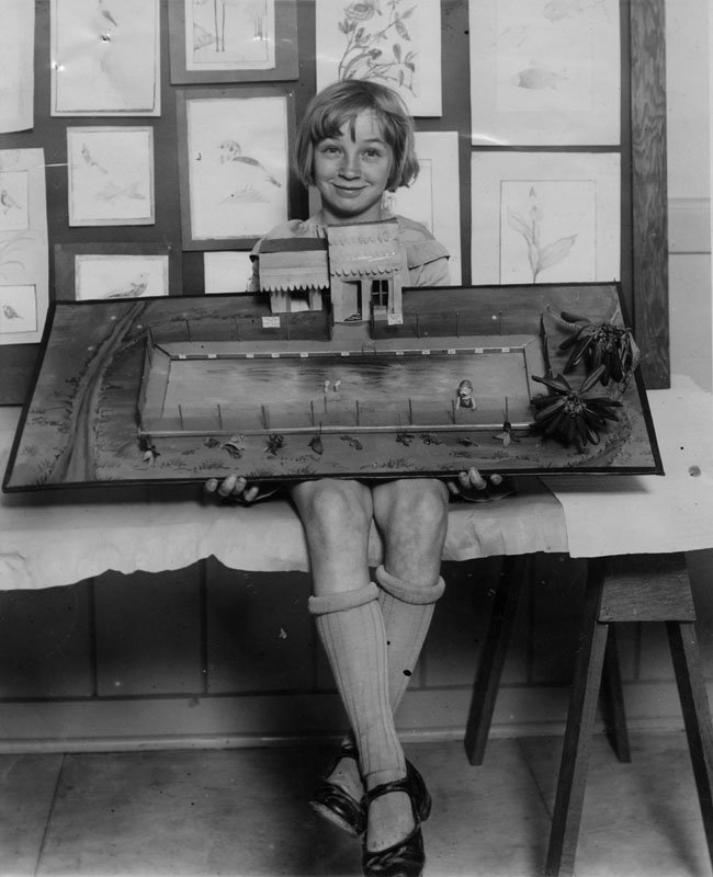 Eleanor Gilligan holds a display from the exhibition at Echo Park. The display is a miniature swimming pool resembling the Yosemite playground: http://lapl.me/m78TlIW  #ArchivesHashtagParty #ArchivesCraftypic.twitter.com/Qq7PUD00AN