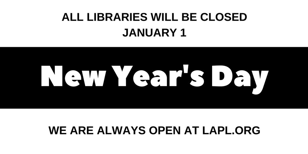 Plan ahead, all libraries will be closed New Year's Day. We're always open at http://lapl.me/VDNRRqi pic.twitter.com/x8x89rFJjB