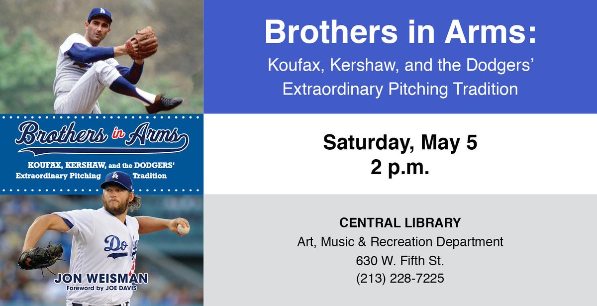 Jon Weisman will discuss and sign his latest book, "Brothers in Arms: Koufax, Kershaw, and the Dodgers' Extraordinary Pitching Tradition" at Central Library on May 5: http://lapl.me/op1WLQA pic.twitter.com/5D6Dg7TblG