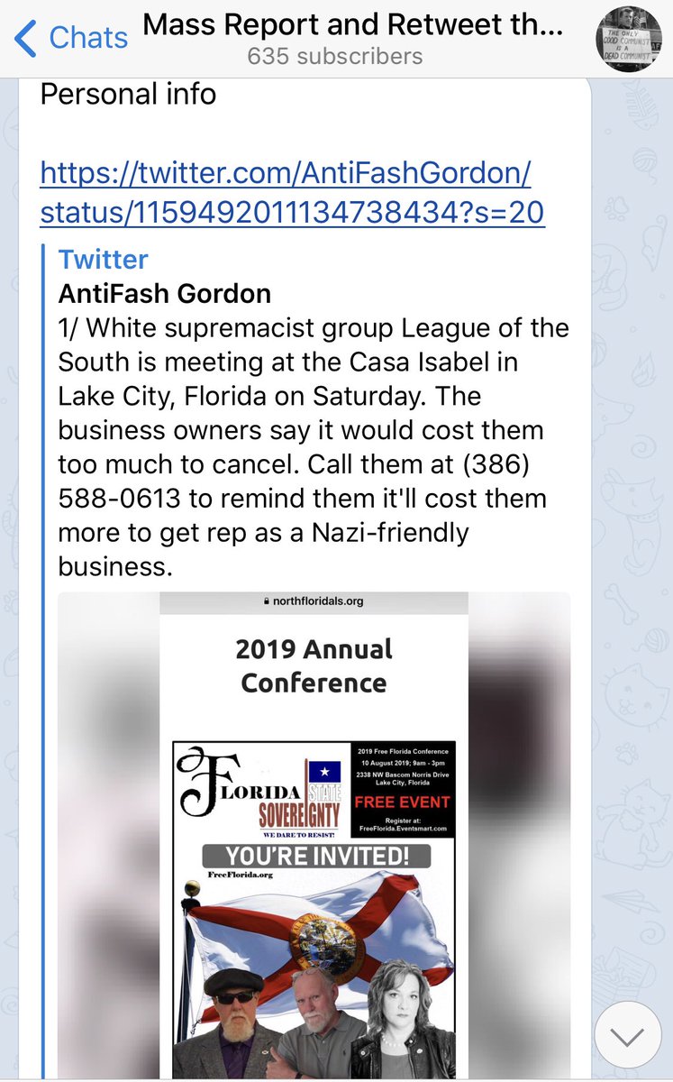 To recap: The Proud Boys’ mass reporting channel went up to bat for: -The League of the South -Identity Evropa -The Daily Shoah dude -The dude mass murderer Robert Bowers’ interacted with the most on Gab -A thirsty topless Nazi on Tinder