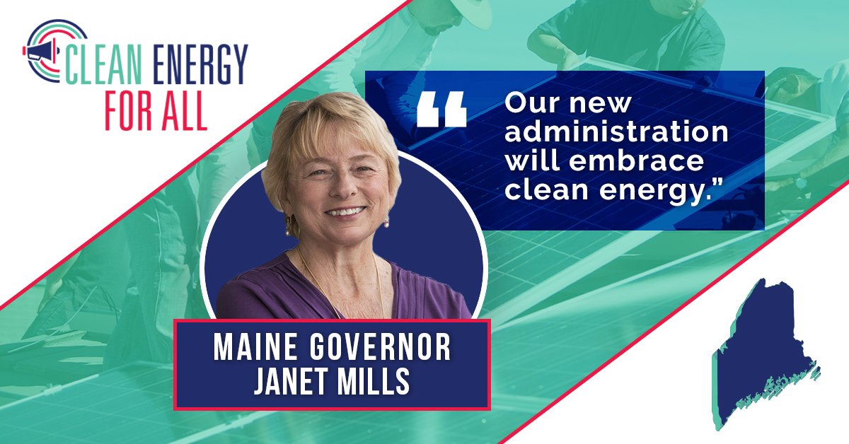 Maine Governor Janet Mills in her inaugural address: "Our new Administration will embrace clean energy; change our modes of transportation; weatherize homes and businesses, and reach a goal of 50 percent of our electricity coming from Maine renewable resources.pic.twitter.com/0sWh1MTpac