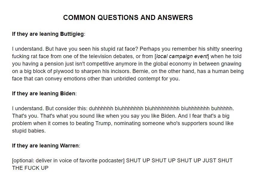 The gloves are finally off. Bernie is stealthily going negative on his rivals in this leaked volunteer script.pic.twitter.com/RpVbp9Hvuw
