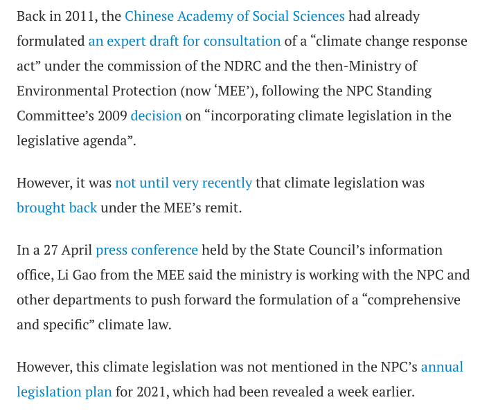 I briefly examined the status quo of climate legislation in China in the Q&A on ETS @CarbonBrief https://www.carbonbrief.org/in-depth-qa-will-chinas-emissions-trading-scheme-help-tackle-climate-change … Back in 2011, NDRC & the then-MEP (now MEE) already commissioned an "expert draft for consultation" of a "climate change response act" slow progress since...pic.twitter.com/laS2zXx0MS