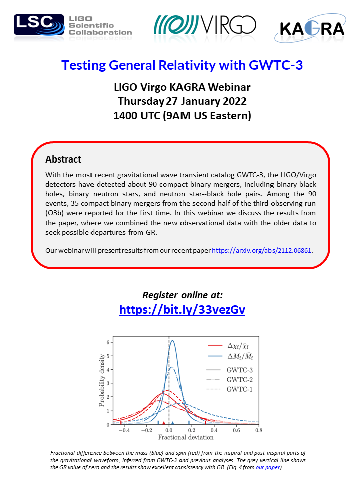 @LIGO@ego_virgo@KAGRA_PR webinar is on *Thu Jan 27* at 9AM US Eastern (1400 UTC). Join us on Zoom for "Testing General Relativity with#GWTC3", when we present results from our recent paper https://arxiv.org/abs/2112.06861 . Register at https://bit.ly/33vezGv . All welcome!pic.twitter.com/y2aoCQa9ju
