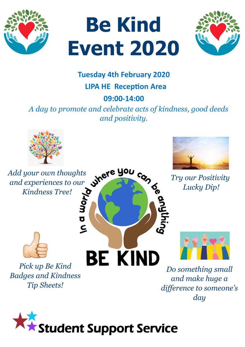 Tomorrow the LIPA Student Support team are holding 'Be Kind', a day to promote and celebrate acts of kindness, good deeds and positivity! So come along to the reception area, say hello to the team, share stories of good deed and try your luck with the Positivity Lucky Dip!