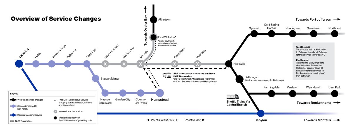 Instead, use Babylon, Hempstead, Montauk or Pt Wash branches next weekend. Special timetables will be in effect for ALL LIRR branches next Saturday/Sunday. For details, visit:https://bit.ly/2S9r9Wq