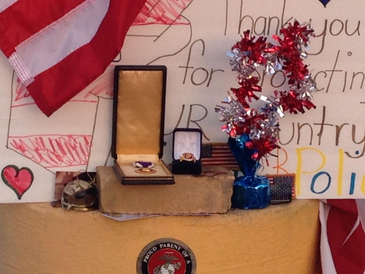 A military serviceman left his purple heart at the memorial on Lee Hwy. Next to it a Marine's ring.