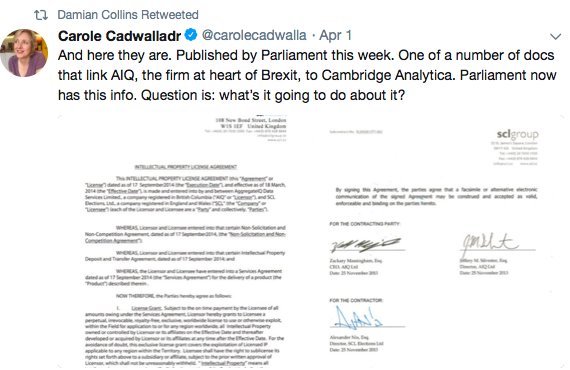 And here’s the email - published by Parliament - that shows Jeff Silvester of AIQ & Alexander Nix of Cambridge Analytica working jointly on the Facebook data. They’ve both denied this. Repeatedly. So, here’s a q. Did Vote Leave have access to it?? Or models derived from it?pic.twitter.com/X5MWjiRQih