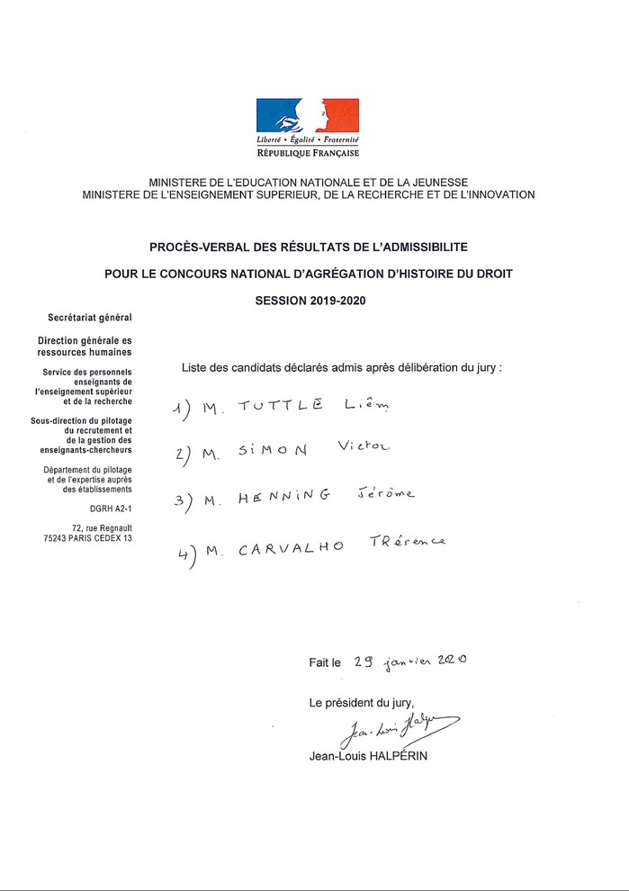 Agrégation d'histoire du droit 2019-2020 : 4 candidats déclarés admis. https://univ-droit.fr/actualites-de-la-recherche/vie-academique/34179-resultats-du-concours-d-agregation-d-histoire-du-droit-2019-2020 …pic.twitter.com/CiGCrxn9pM