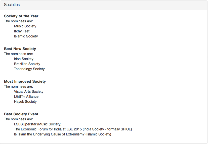 The Societies Awards shortlist is now out! Congrats to everyone nominated! http://lsesu.com/activities/awards …