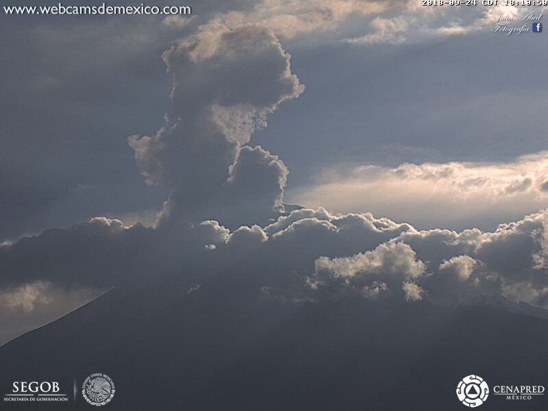 Se registran 2 exhalaciones del #Popocatépetl una a las 18:07 horas y la segunda a las 18:12 con una altura de 1.9 km con fumarola en dirección sur-suroeste, con contenido bajo de ceniza.