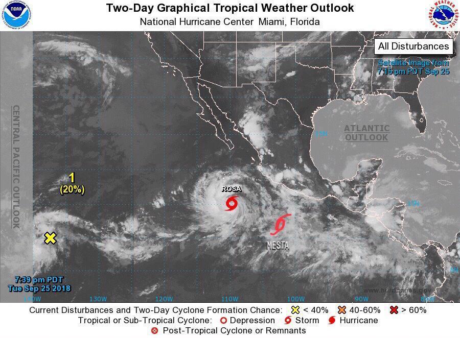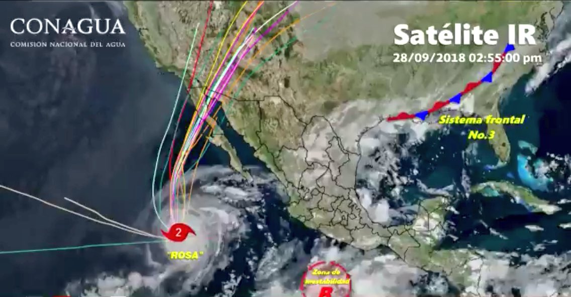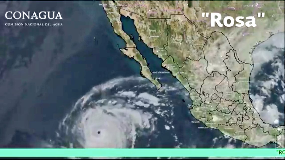 #Huracán Cat. 2 #ROSA se localiza a 785 km al suroeste de Cabo San Lázaro, BCS., y a 875 km al sur-suroeste de Punta Eugenia, B.C.S. Vientos de 165 km/h, rachas de 205 km/h y se desplaza hacia el norte. Potencial de tormentas en el noroeste del país y la Península de B.C.pic.twitter.com/PJH4ZF4aB8