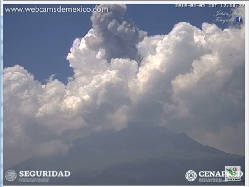 Exhalación del #Volcán #Popocatépetl a las 12:15 horas, con una altura de 2,000 metros, acompañada de contenido bajo de ceniza y en dirección suroeste. Vía #CENAPREDpic.twitter.com/sHteuMQBYS