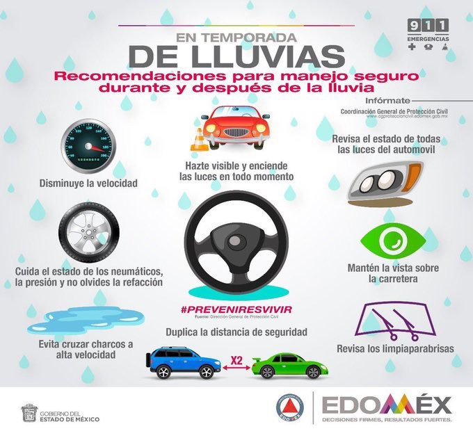 Maneja con precaución en esta temporada de #Lluvias, atiende las siguientes recomendaciones de #ProtecciónCivil, para así evitar un #Accidente #PrevenirEsVivirpic.twitter.com/lutKRNBzaC
