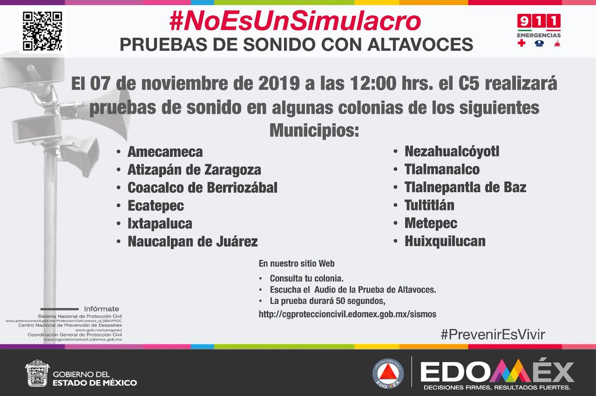 El día 7 de noviembre a las 12:00 horas el @C5Edomex, llevará a cabo prueba de los altavoces del Sistema de Alerta Pública. Conoce los municipios y colonias en las que se realizará la prueba. #PrevenirEsVivir http://cgproteccioncivil.edomex.gob.mx/sismos @SS_Edomex @C5Edomexpic.twitter.com/2AQmv4Z9oV